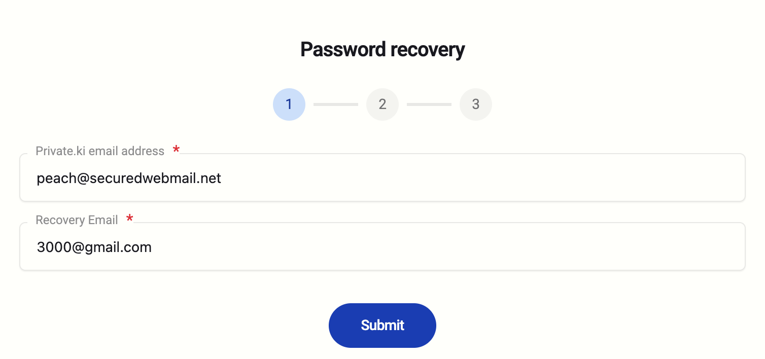 On the next screen, enter your Private.Ki email address and your recovery email address: