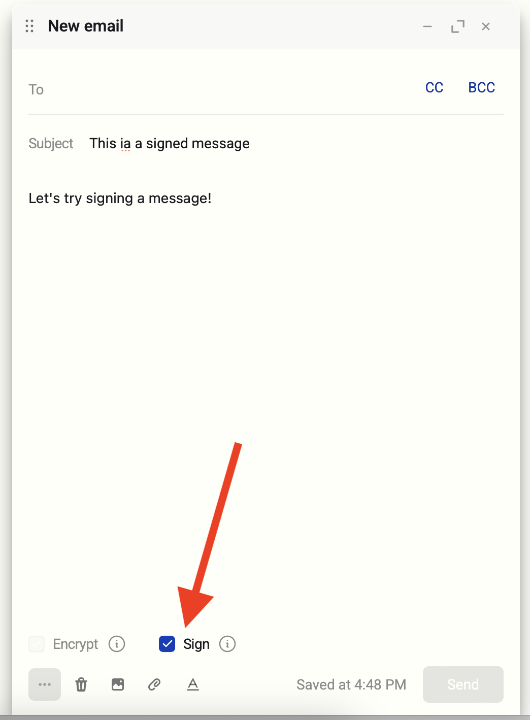 All internal messages (from and to Private.Ki users) are automatically signed with PGP. When you sign an email in Private.Ki, you are appending a cryptographic signature generated with your private PGP key. This process is automatically enabled when you compose an email to a Private.Ki user: