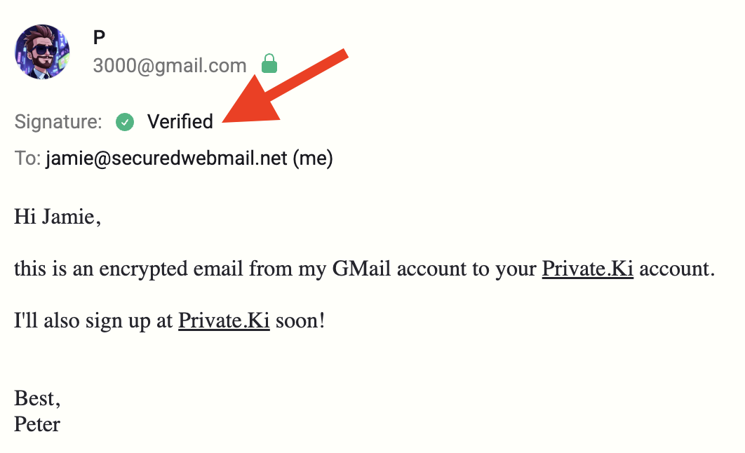 Be careful: This only means that the email is coming from the Private. Ki account. You can assume that the sender's account is safe, and only he is in possession of the login password and the passphrase. But in reality, there is no way to be 100% sure that it's this person using his account sending this email.