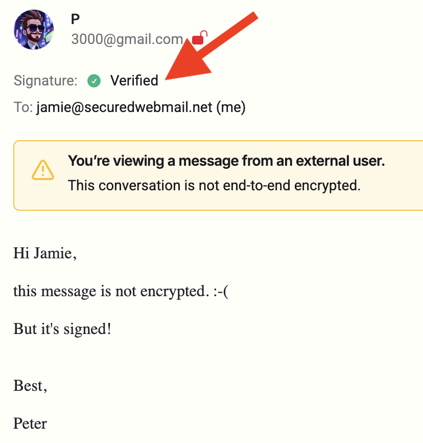 When you receive a message from an internal user whose signature has been verified, it will look like this: