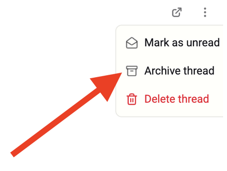 To archive a whole conversation, open any message in that thread and click the ⋯ menu at the top right. Choose Archive thread from the 3-dot dropdown menu. Every message in the thread will then move to the Archive folder:
