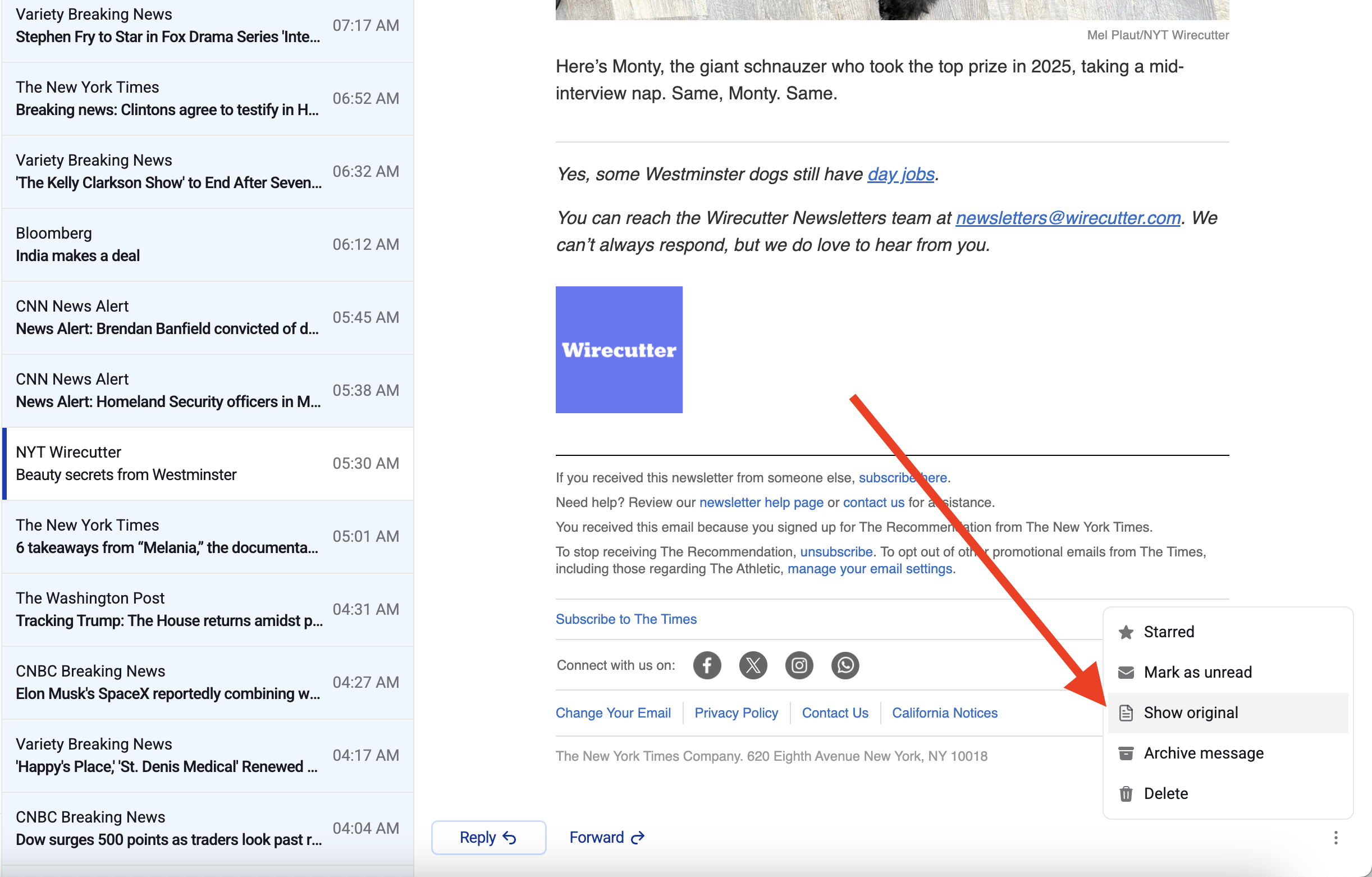 Open the email you want to inspect. In the right column (message view), scroll all the way to the bottom of the message. Click the three-dot menu. Click Show original: